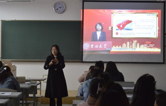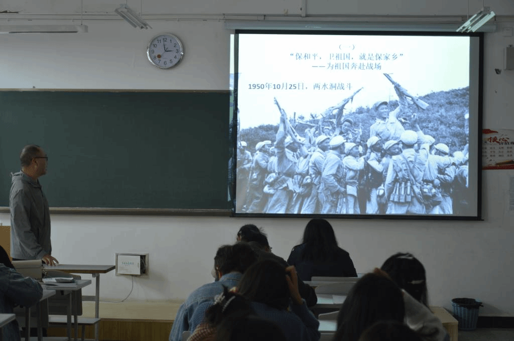 孔元元老师作为一名党员,首先对入党积极分子讲述了作为党员必须做到的要求,以此来约束同学们的行为举止。紧接着向同学们讲述了《新时代高校教师职业行为十项准则》并向老师提出共勉“作为一名教师,我们应结合教书育人实践,增强行动自觉,做以德立身、以德立学、以德施教、以德育德的楷模”。张辉老师讲述的是致最可爱的人——抗美援朝精神。张辉老师通过讲述自己身边参加过抗美援朝的人和抗美援朝战争的故事,深刻表达出了抗美援朝战争中的爱国主义精神和为和平、为正义的精神。张辉老师通过歌曲《我的祖国》的一句歌词“一条大河波浪宽”中的“大河”,引发了同学们的思考,并说出了他认为的大河就是祖国和人民。