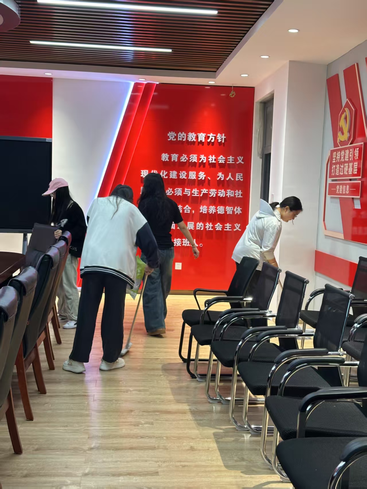 理论学习入脑入心,实践服务见行见效。5月31日,学员们将学习热情转化为实际行动,积极参与志愿服务活动。大家分工协作,对学院党建活动室及大厅进行了彻底清扫。擦拭桌椅、整理资料、清洁地面、规整物品……学员们发扬不怕脏、不怕累的精神,认真细致地投入到劳动中。经过共同努力,党建室和大厅环境焕然一新,为师生营造了更加整洁舒适的学习与活动环境。这次志愿清扫不仅是一次体力劳动,更是一次深刻的党性实践,让发展对象们在服务奉献中体会到了“为人民服务”的根本宗旨,增强了责任感和归属感。