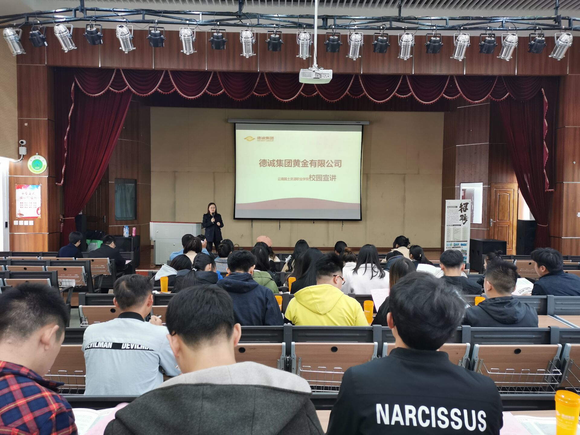 2019年11月14日珠宝玉石学院邀请到德诚集团黄金有限公司到学校光荣讲堂举行宣讲会,学院宝玉石鉴定与加工、首饰设计与工艺、建筑材料生产与管理等专业的同学参加宣讲会。