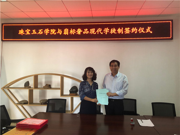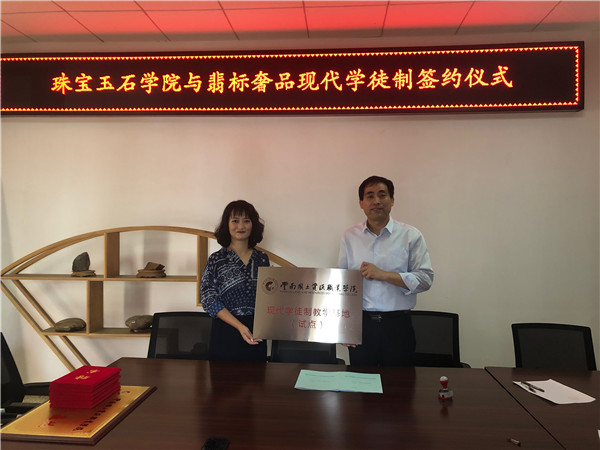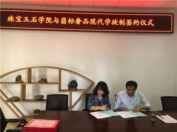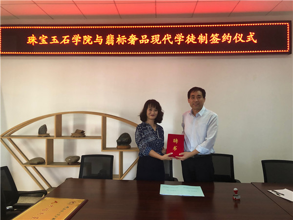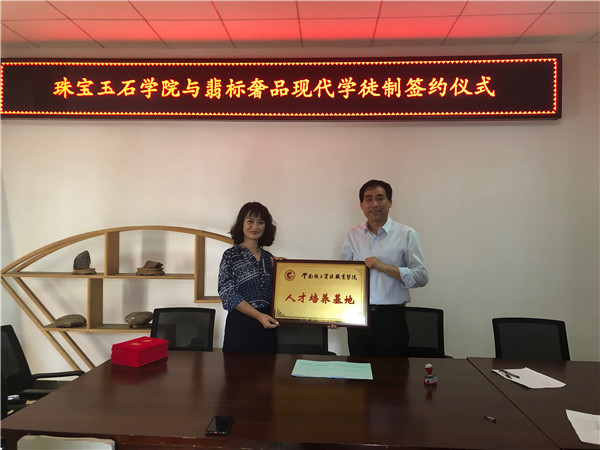 2019年6月26日下午,珠宝玉石学院与翡标奢品现代学徒制签约仪式在学院办公室举行。双方就如何推进校企合作、“现代学徒制”等方面进行深入交流,双方就合作意向达成一致,签订了协议书、举行了授牌仪式并对企业人员颁发了聘书。