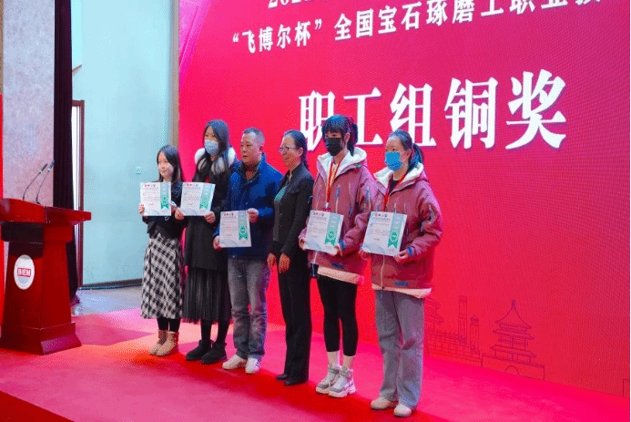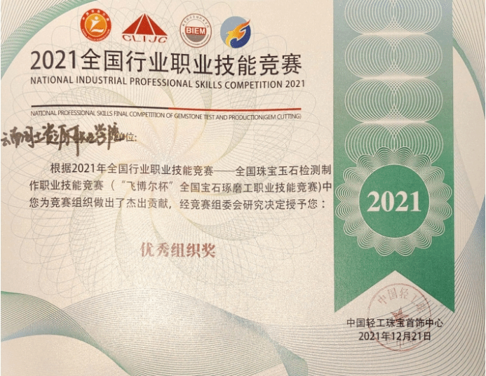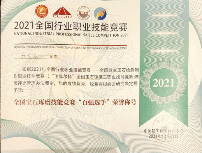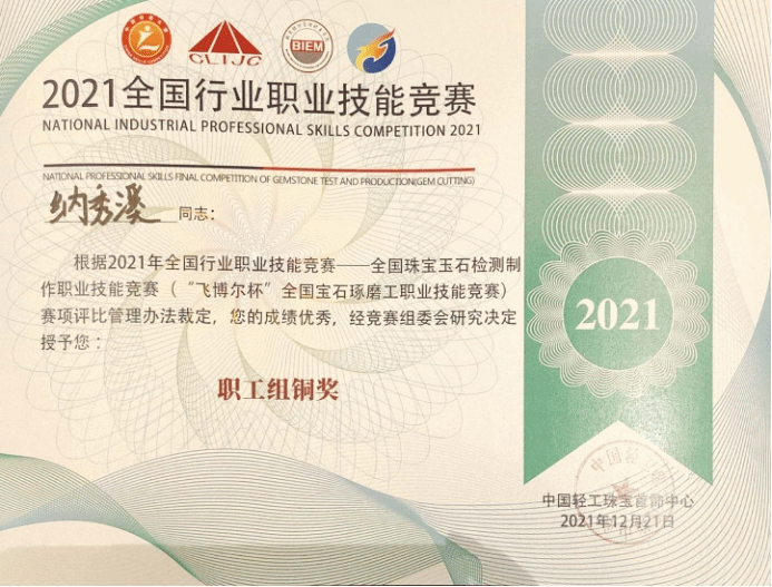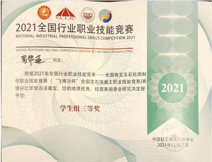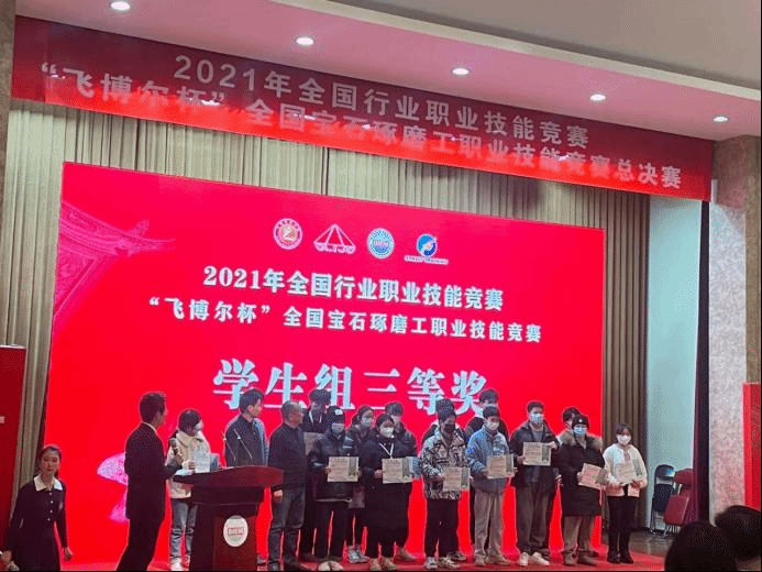 世界杯官网的罗帮莲同学获得学生组三等奖和全国宝石琢磨技能竞赛“百强选手”称号,纳秀溪老师获得职工组铜奖与“全国轻工技术能手”称号、全国宝石琢磨技能竞赛“百强选手”称号;在线买世界杯平台获得“优秀组织奖”。