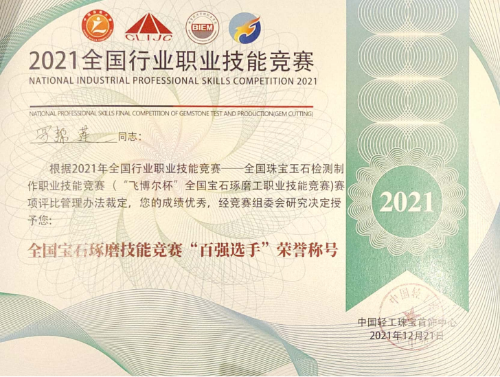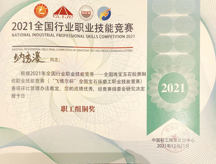 经过全国四个地区选拔赛脱颖而出的选手共计90名,来自全国各地26个省市的35个参赛队同台竞技,经过2天激烈地角逐,纳秀溪老师和罗帮莲顺利完成各项比赛。纳秀溪老师获得职工组铜奖与“全国轻工技术能手”称号、全国宝石琢磨技能竞赛“百强选手”称号。罗帮莲同学获得学生组三等奖和全国宝石琢磨技能竞赛“百强选手”称号;在线买世界杯平台获得“优秀组织奖”。