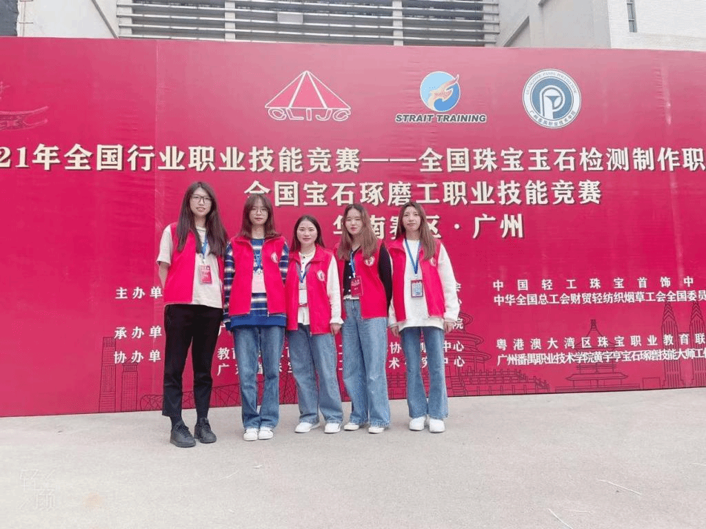2021年10月31日纳秀溪老师带领宝玉石鉴定与加工专业四名学生罗帮莲、张媛、庄宇梅、杨晓青前往广州番禺职业技术学院,参加了“2021年全国行业职业技能竞赛‘飞博尔杯’宝石琢磨工职业技能竞赛”初赛。经过激烈比拼,通过理论测试和实际操作技能两个竞赛环节,最终,纳秀溪老师和罗帮莲顺利进入决赛。