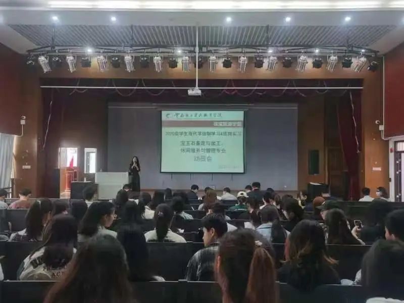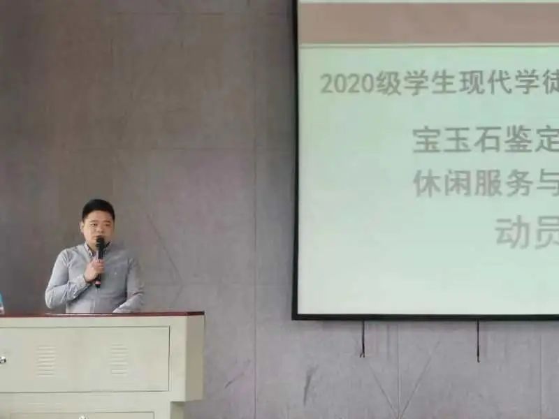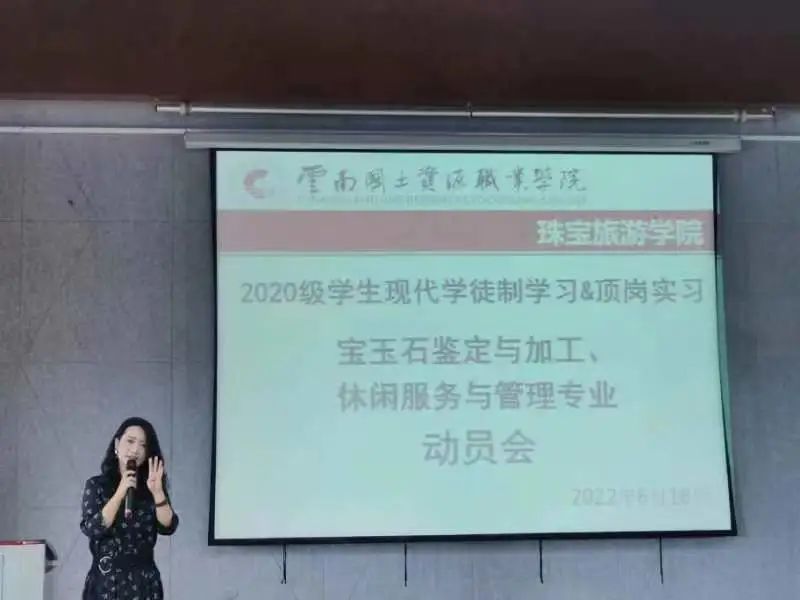 为加强学生对现代学徒制、顶岗实习的认识和了解,引导学生做好顶岗实习前的各项准备工作,推动现代学徒制和后期顶岗实习工作的顺利开展。在线买世界杯平台于6月16日在红山讲堂召开宝玉石鉴定与加工及休闲服务与管理两个专业的现代学徒制及顶岗实习动员大会。会议由吕明老师主持,在线买世界杯平台院长陈畅、党总支书记张颖、副院长杨家娣、党总支副书记张军红、就业与校企合作处陆祥老师、各班指导老师、班主任、辅导员、2020级宝玉石鉴定与加工、休闲服务与管理专业全体同学参加动员大会。