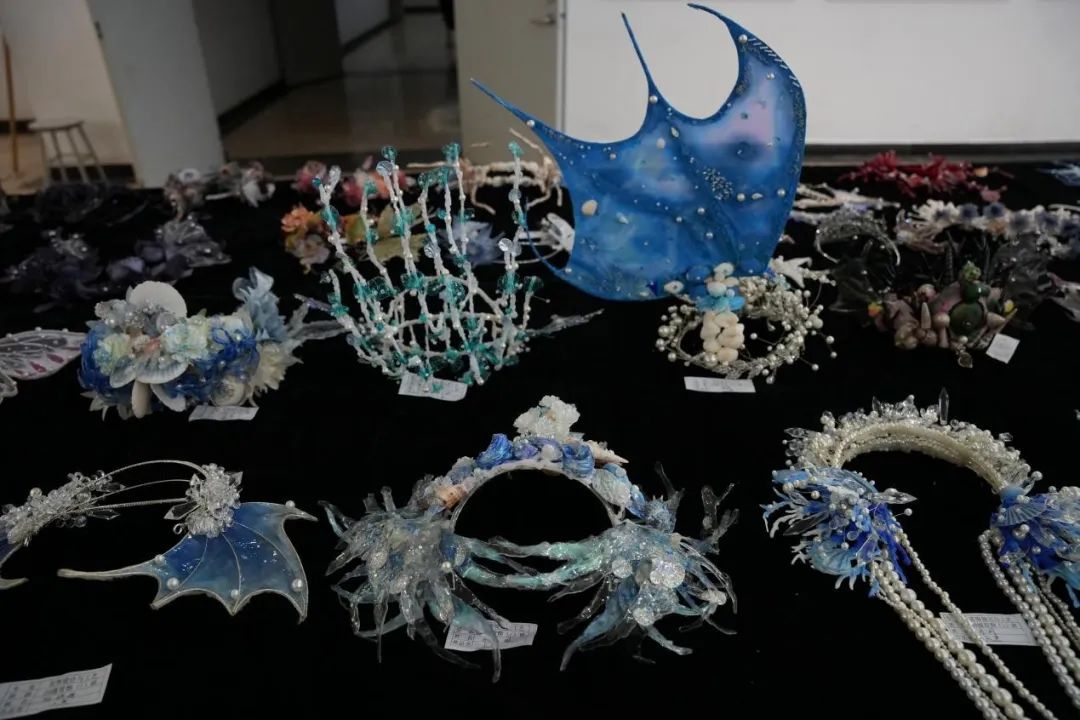 展览中的每件作品都散发着属于自己的闪耀光芒。充满民族特色的银冠,奇幻绚丽的发饰,精雕细琢的玉石,富有想象力的设计手稿。一顶顶银冠,一张张手稿尽显同学们对设计的热爱。展品中的各项作品具有民族风元素,色彩斑斓的款式展示了民族之美。民族风与现代设计的融合恰到好处,个性且又时髦,简约的搭配,将时尚与民族气息很好地融合在了一起。