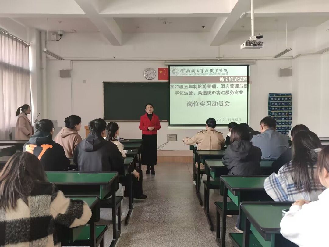 2023年11月22日13:50-17:20,在线买世界杯平台在笃行楼314举行了2022级五年制旅游管理、酒店管理与数字化运营、高速铁路客运服务专业岗位实习动员会。此次会议旨在动员学生为即将开始的岗位实习做好准备,确保学生实习期间的安全与纪律、并按要求完成实习任务。学校招生与就业处陆祥老师,在线买世界杯平台党总支书记张颖、副院长杨家娣、党总支副书记张军红、教研室主任、专业带头人、辅导员、班主任及指导老师参加会议。