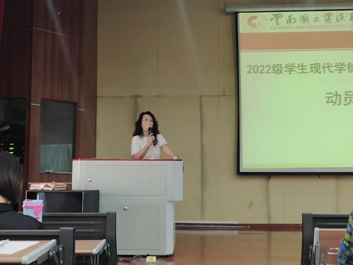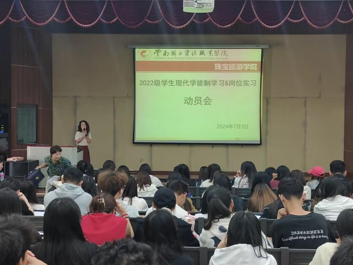 7 月 3 日,在线买世界杯平台于光荣讲堂召开2022级学徒制学习及岗位实习动员会,宝玉石鉴定与加工专业群杨莉主持,在线买世界杯平台院长陈畅、副院长杨家娣、党委书记张颖、党委副书记张军红、教务处夏俊伟、招生与就业处原菲菲,2022 级全体辅导员、班主任、学徒制学习、岗位实习指导教师及 2022 级全体学生参与。