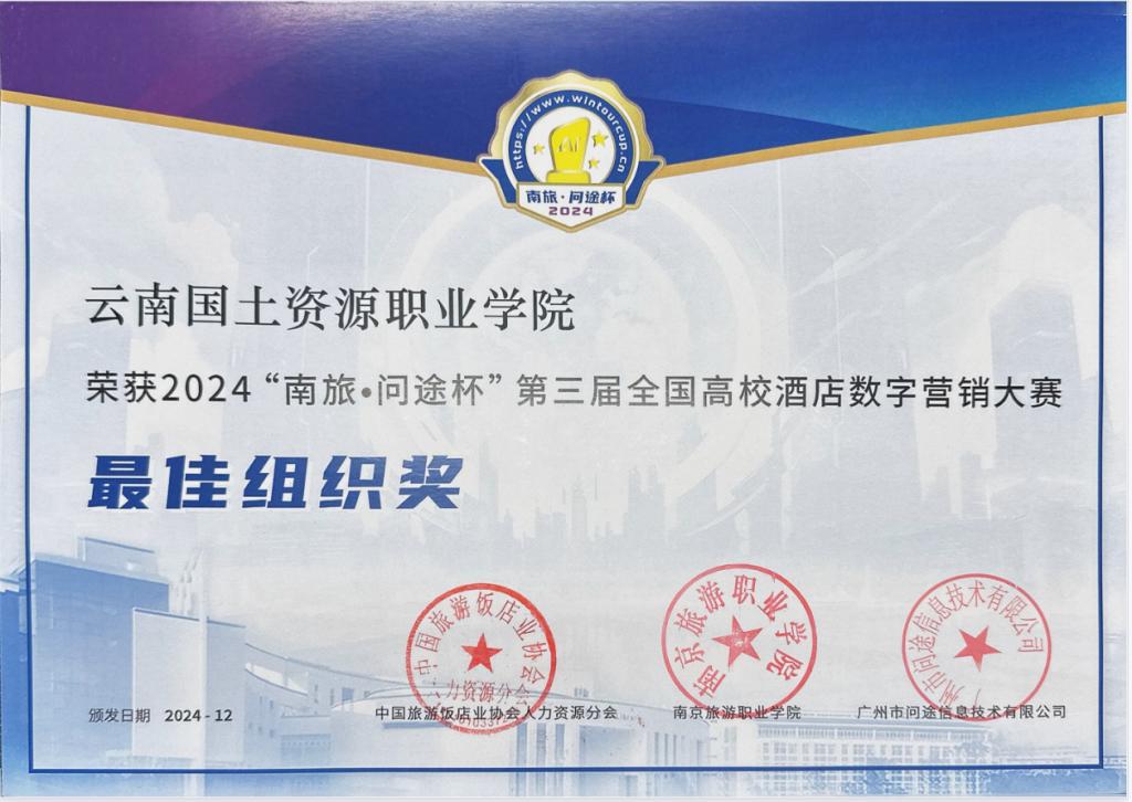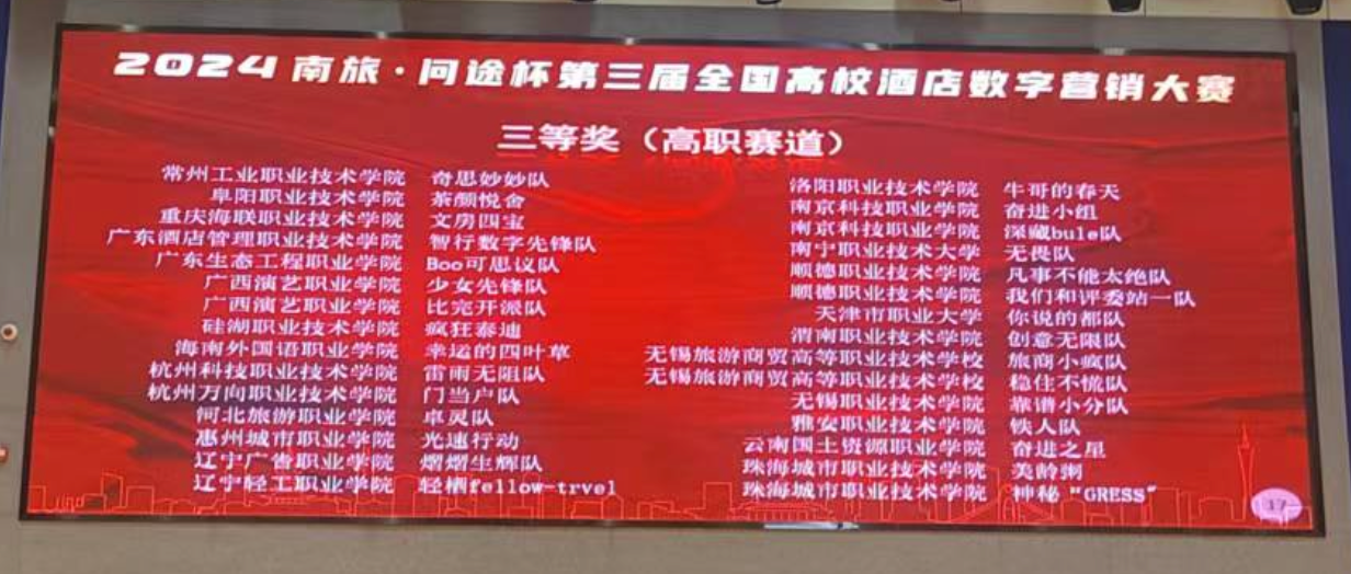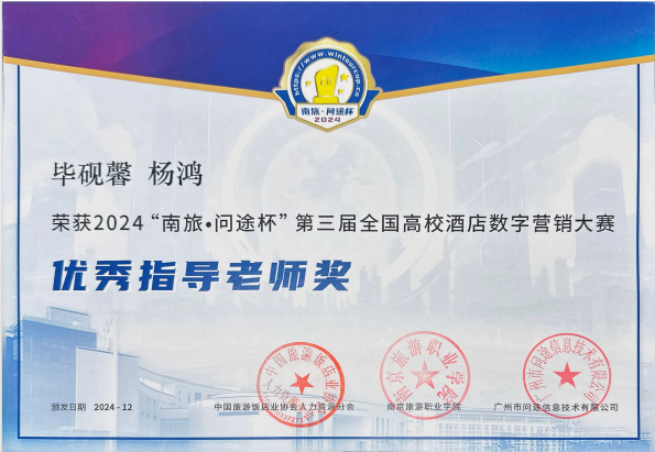 2024年12月7日,备受瞩目的“南旅·问途杯”第三届全国高校酒店数字营销大赛圆满落下帷幕。比赛紧密围绕产业数字化转型需求和酒店数字营销工作场景设计竞赛内容和任务,融入了最新的数字化技术和人工智能多模态AIGC技术。经过激烈角逐,来自在线买世界杯平台酒店管理与数字化运营专业的三支参赛队伍脱颖而出,获得了令人瞩目的成绩。其中,天一队(队员:代雪芬、赵燕青、苏云丽、张贵华)和齐凌梦想家队(队员:蒲璇宇、左顺玉、李天玲、陆蓉)凭借出色的团队协作与创新思维,成功摘得全国一等奖的桂冠;奋进之星队(队员:黄丽、刁冬梅、石火喷、李思懿)也不负众望,荣获全国三等奖。