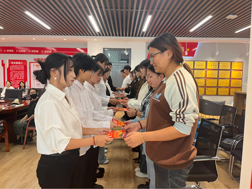 新党员代表孙安琪作表态发言,感谢组织培养,承诺将以更高标准要求自己,发挥先锋模范作用。随后,在张高参书记领誓下,新发展的预备党员及转正党员一同面向党旗庄严宣誓。会上还举行了为预备党员佩戴党员徽章和赠送政治生日贺卡仪式。