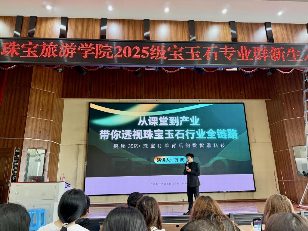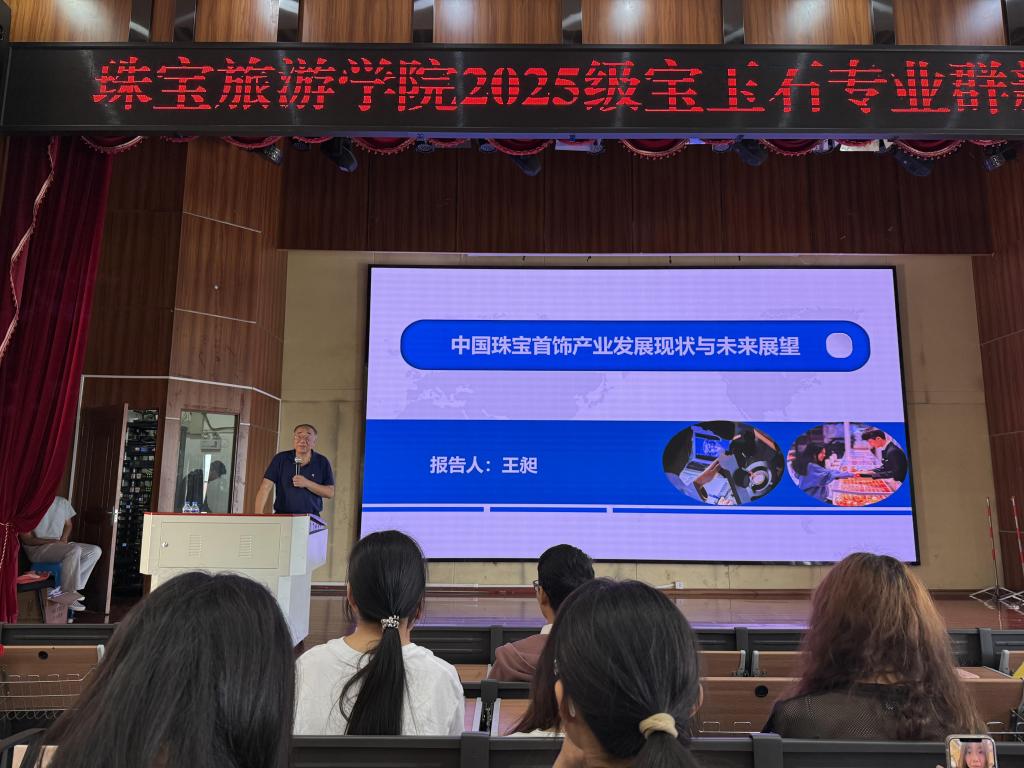 会上,王昶老师以《中国珠宝首饰产业发展现状与未来展望》为题,从发展脉络、行业特征、产业集群、未来趋势四大维度系统梳理产业全景,并寄语新生实现知识、能力与素养的深度融合。