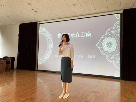 第一位是高级导游、文旅部“金牌导游”、民族博物馆专题讲解员蔡淑玲老师。她讲座的主题是《非遗传承在云南》,蔡老师从三个方面为我们讲解了什么是非物质文化遗产、非物质文化遗产与旅游有什么关系、云南的非物质文化遗产代表作品(鹤庆银器、乌铜走银、斑铜等)。