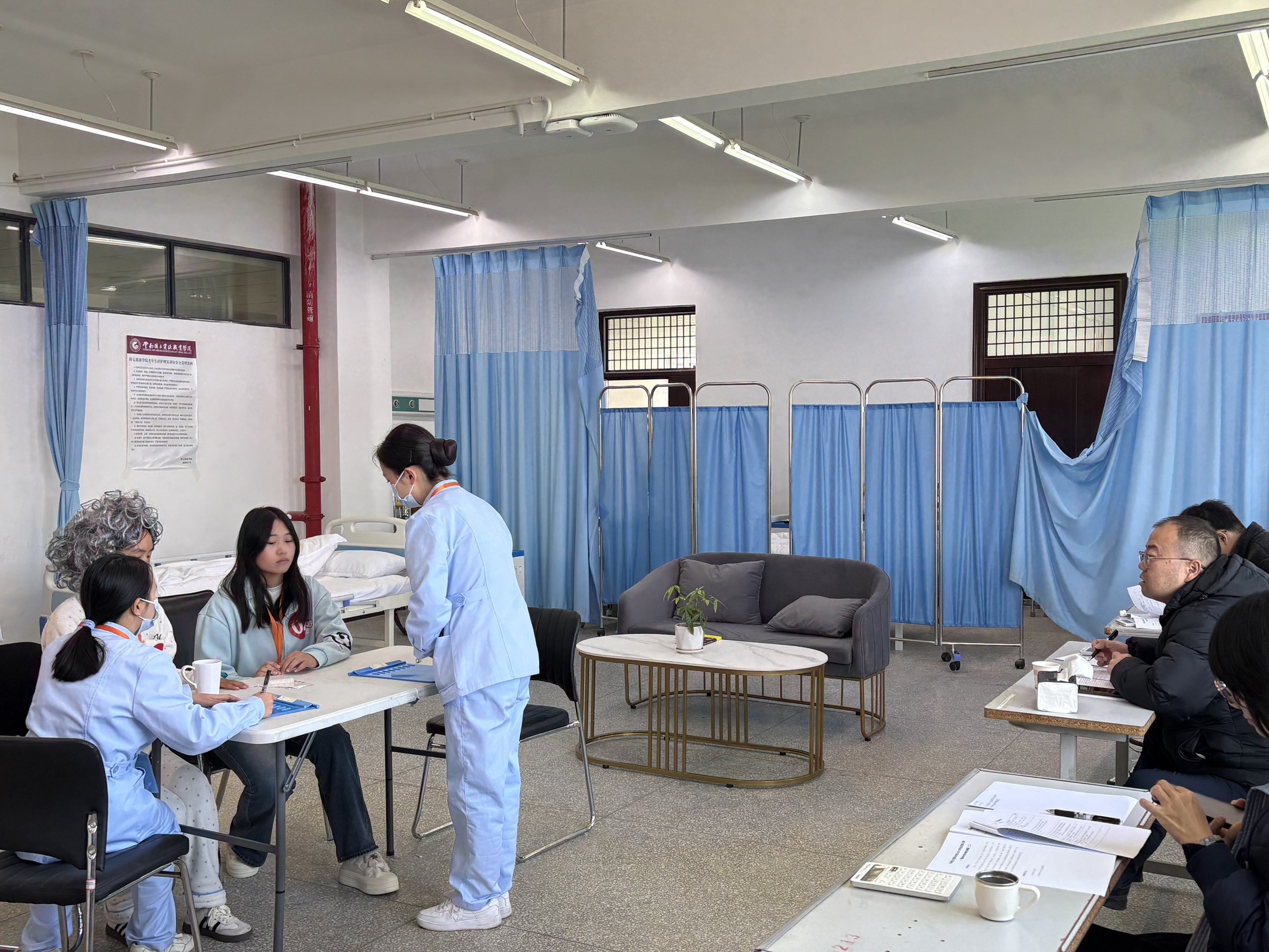 本次赛项设置“模拟老年沟通评估”“生活照护实操”等贴合行业的环节,12个小组围绕不同场景差异化展示。有的侧重心理疏导,以共情沟通安抚模拟长者;有的聚焦失能照护,操作规范且细节温暖;还有的专攻健康监测,体征记录精准高效。而现场评委团全程保持高度专注,不仅严格依据专业标准评分,更在实操间隙针对细节给出指导,例如提醒选手“协助长者起身时,支撑点应兼顾舒适与安全”,或是指出“沟通时的眼神交流能增强长者信任感”,严谨中透着对学生技能成长的细心关切。