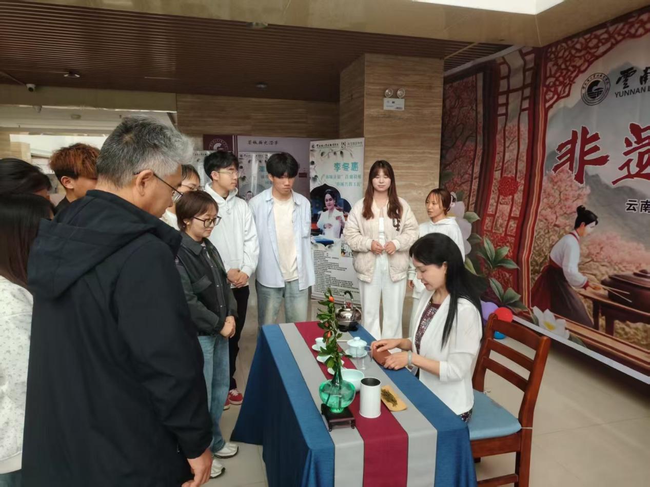 国家级评茶技师、云南省“春城计划”首席技师李冬惠老师以其深厚的茶学功底和优雅的茶艺表演,将现场师生带入了一个茶香四溢的世界。李老师从茶席设计开始,详细讲解了茶席的布置原则、器物搭配以及意境营造,每一个细节都体现着对茶文化的深刻理解。随后,她亲自演示了茶叶冲泡的技巧,从温杯、投茶、注水、出汤,每一个动作都行云流水,优雅至极。在茶汤品鉴环节,李老师引导师生们通过观色、闻香、品味,感受不同茶叶的独特风味,并深入浅出地讲解了茶叶的产地、品种、制作工艺等知识。现场师生们认真聆听,积极提问,与李老师展开了热烈的互动交流,气氛十分融洽。