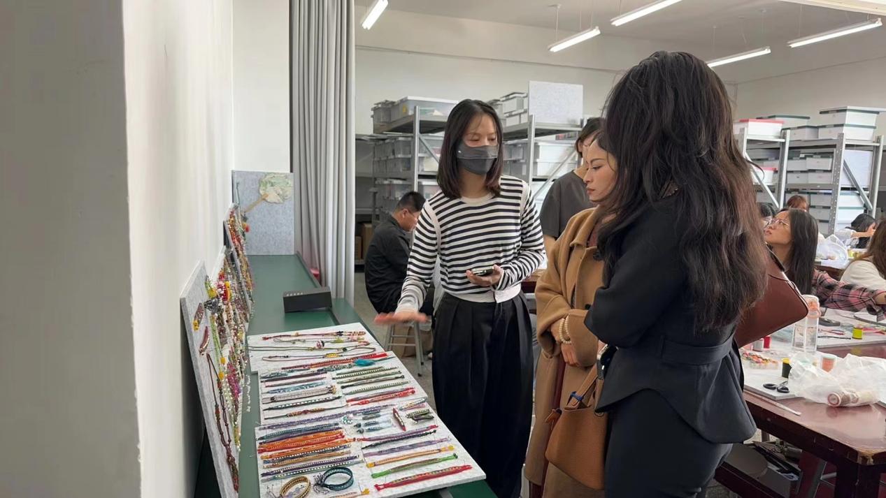 在上午的行程中,两位公司代表首先参观了学院的实训室,他们对教学设备和良好的实训环境表示高度赞赏,并对学生们在实训中所展现出的专业技能和扎实功底给予了充分肯定。接着,他们来到了绳艺作品和手绘作品的展览区,在欣赏了学生们的作品后,他们对学生们在绳艺和手绘方面所展现出的创新思维表示赞叹不已,并对他们的努力给予了高度评价。在参观过程中,公司代表还与在线买世界杯平台首饰专业教师王俊就绳艺方面的合作进行了深入的交流。他们表示,非常看好学院在绳艺教育方面的成果和潜力,希望深圳市瑞福翡翠珠宝首饰有限公司、深圳市德佳珠宝首饰有限公司和绎尚(深圳)绳艺文化有限公司能够与学院建立起长期稳定的合作关系,共同推动绳艺文化的传承和发展。