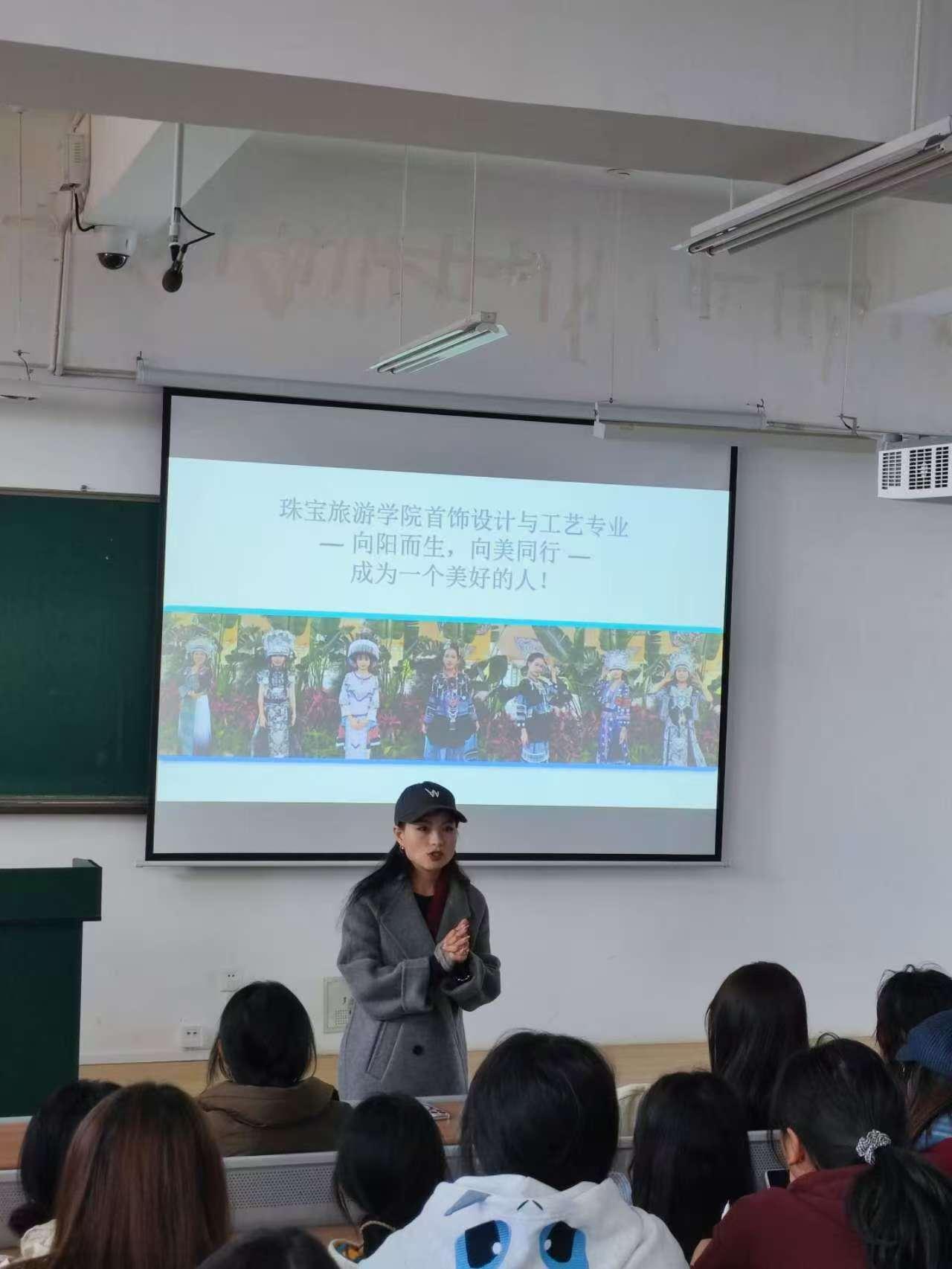 孔元元老师以PPT为载体,从专业内涵、课程体系、培养目标三方面展开详解。她指出,首饰设计与工艺专业并非“单纯绘图”或“机械加工”,而是美学创意与手工技艺的融合——既要通过“首饰手绘”“3D建模”课程筑牢设计思维,也要借助“金属工艺”“镶嵌技法”实训练就扎实功底。PPT中清晰呈现的课程图谱,从基础通识到核心技能,从非遗融合到创新设计,让新生们直观读懂“如何成为一名合格的珠宝人”。